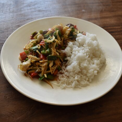 Gewokte Biefstukpuntjes met groenten en rijst