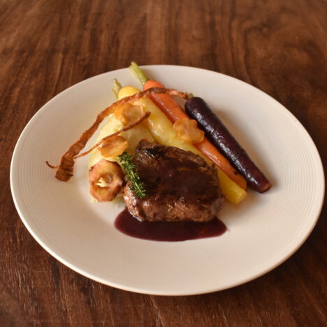 Kogelbiefstuk met rode wijnsaus, pastinaakpuree, pastinaakchips en regenboogwortelen