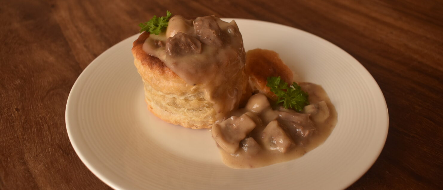 - Serveer de warme ragout in de pasteibakjes. Gebruik peterselie voor de garnering.